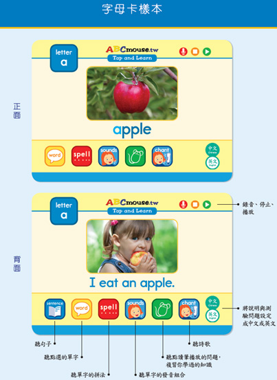 點讀卡幫助孩子辨識許多常見的英語單字,以標準的美語發音說出並唸出這些單字與學會的句型。點讀卡系列包括:26張字母卡、21張基礎發音卡、20張數字卡和11張顏色卡。針對不同的字母、發音、數字和顏色,每張卡片上列有各種學習方法,同時含有圖片以幫助理解。孩子們可以使用點讀功能,來練習單字的唸讀、拼音、發音,以及如何用單字造句。精心設計的點讀功能使這些卡片生動有趣,而且便於攜帶,讓孩子何時何地都可來學習和複習。